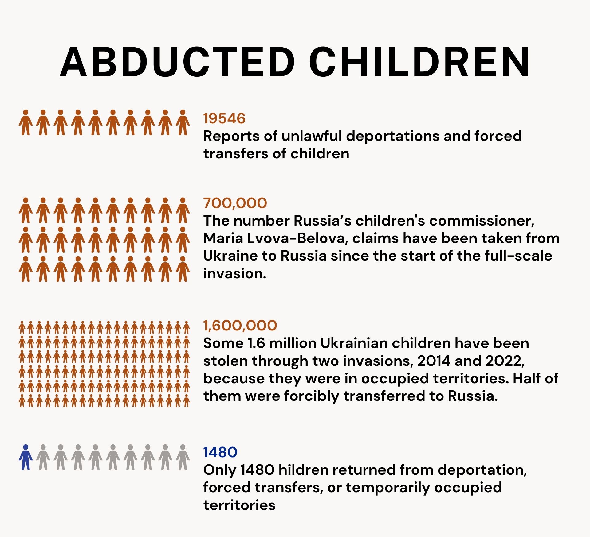 There are no precise numbers for how many Ukrainian children have been abducted and held hostage in Russia or Russian-occupied territories. As time passes, the likelihood of finding and rescuing them becomes smaller and smaller.