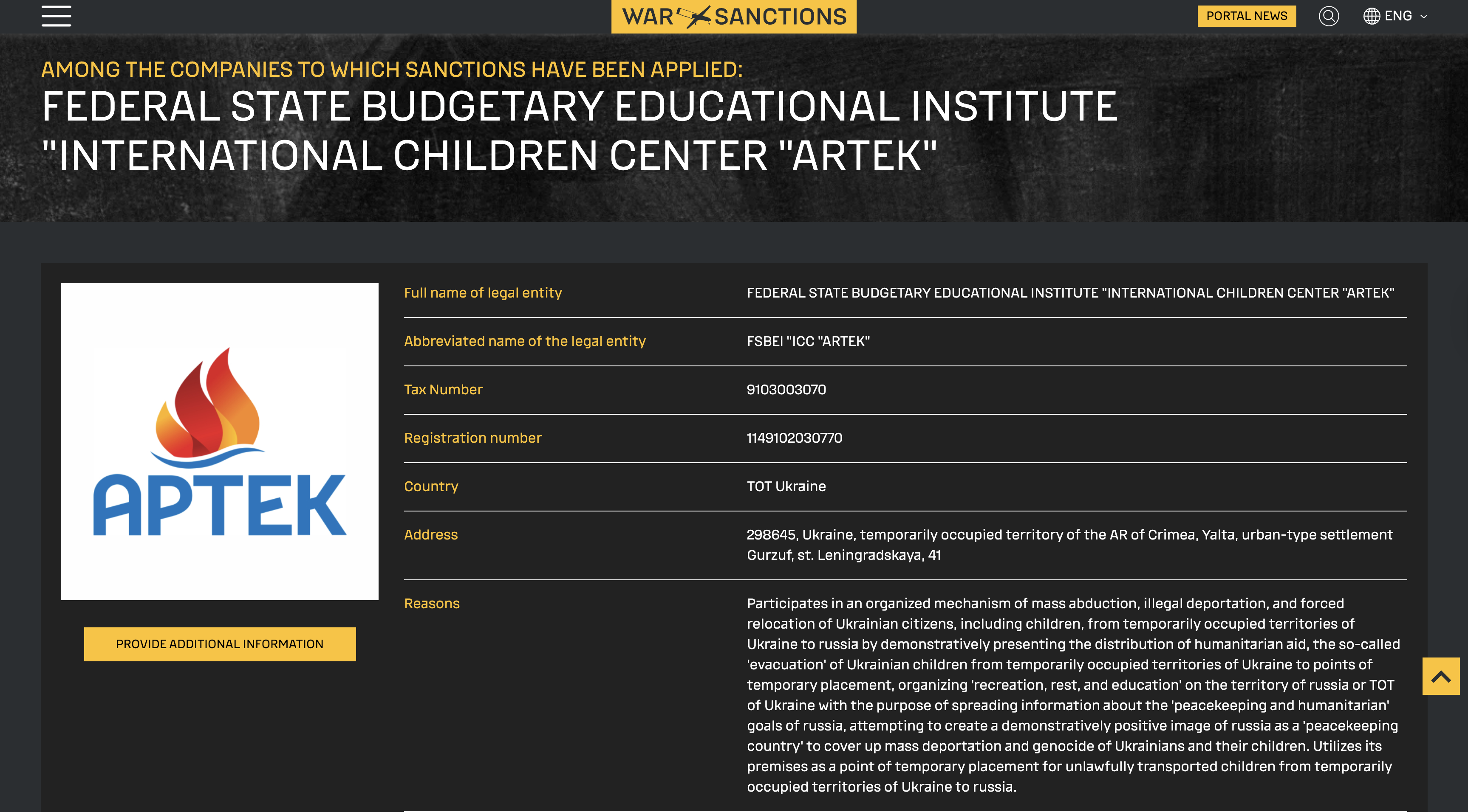 The Ukrainian government’s sanctions portal publishes profiles of individuals and entities involved in the abduction of Ukrainian children. Each entry details the crimes committed, sanctions imposed, and which other countries have enforced measures. Shown here are examples of a sanctioned individual and a sanctioned entity.